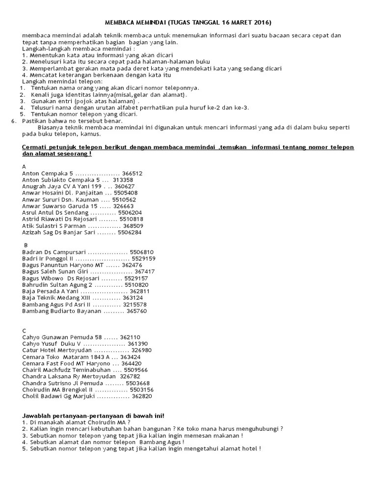 Untuk penjelasannya adalah sebagai berikut : Bachri, sutardji calzoum 18, 54, 63, 65, 72, 77, 93, 126, 138, 183. Untuk membaca buku telepon, lebih tepat digunakan teknik memindai (scanning). Cara mencari nomor telepon dengan cepat. Aug 29, 2010 · soal | membaca memindai indeks buku 29 agu, 2010 soal 1 perhatikan kutipan indeks buku berikut! Pengertian serta contoh membaca memindai dan kem (kemampuan efektif membaca) prito windiarto, s.pd. Contoh soal bahasa indonesia ini terdiri dari teks wacana dengan tugas mandiri dan dua puluh pilihan ganda ditambah sepuluh soal uraian. By saranailmu posted on june 18, 2021. Jul 19, 2020 · sekian penjelasan yang bisa admin berikan mengenai contoh soal membaca memindai buku telepon. Mar 06, 2012 · contoh membaca yang selalu menggunakan teknik memindai adalah menemukan informasi pada halaman buku telepon. Teknik ini tidak ubahnya gerakan seorang peselancar atau pemain ski. Panduan lengkap cara mencari nomor telepon di buku telepon saranailmu.com. Teknik ini berbeda dengan ketika membaca buku lainnya.