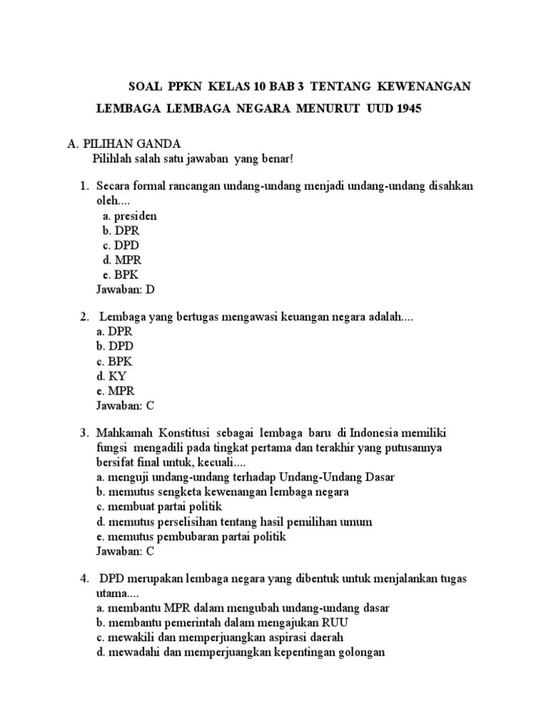 Maka goresan pena pada pola soal kali ini merupakan bab keempat, untuk bab pertama hingga ketiga, sanggup anda baca pada tulisan: 17,6 x 25 ,5 jual buku ringkasan dan latihan soal ppkn sma kelas x k.13 revisi. Pola soal pkn kelas x . Kewenangan negara untuk kependudukan dan keluarga berencana dimediasi oleh menteri… a. Tim sosio creative tebal :